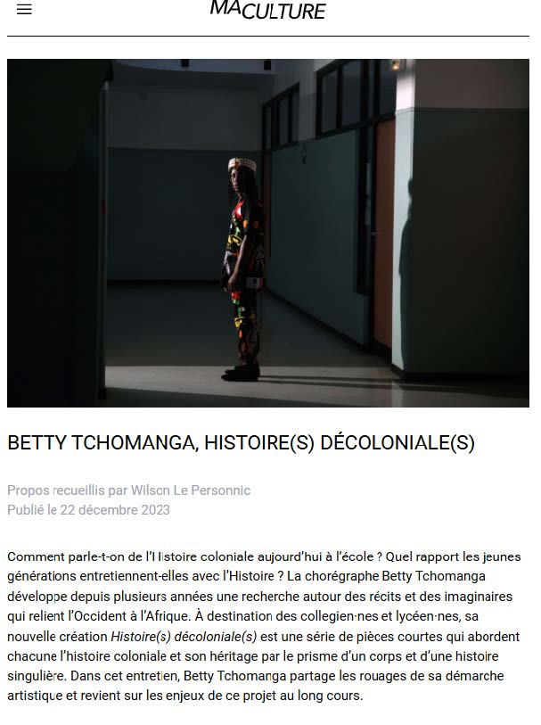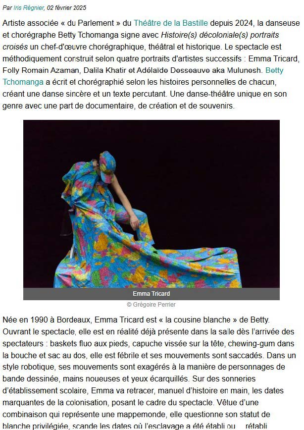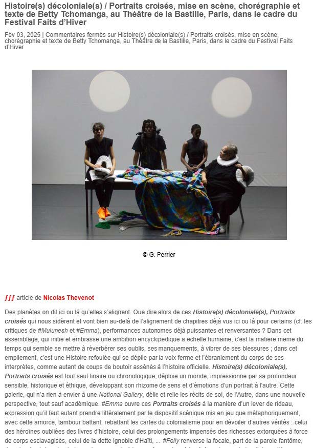 « Betty Tchomanga signe avec Histoire(s) Décoloniale(s) portraits croisés un chef-d'oeuvre chorégraphique, théâtral et historique. »
