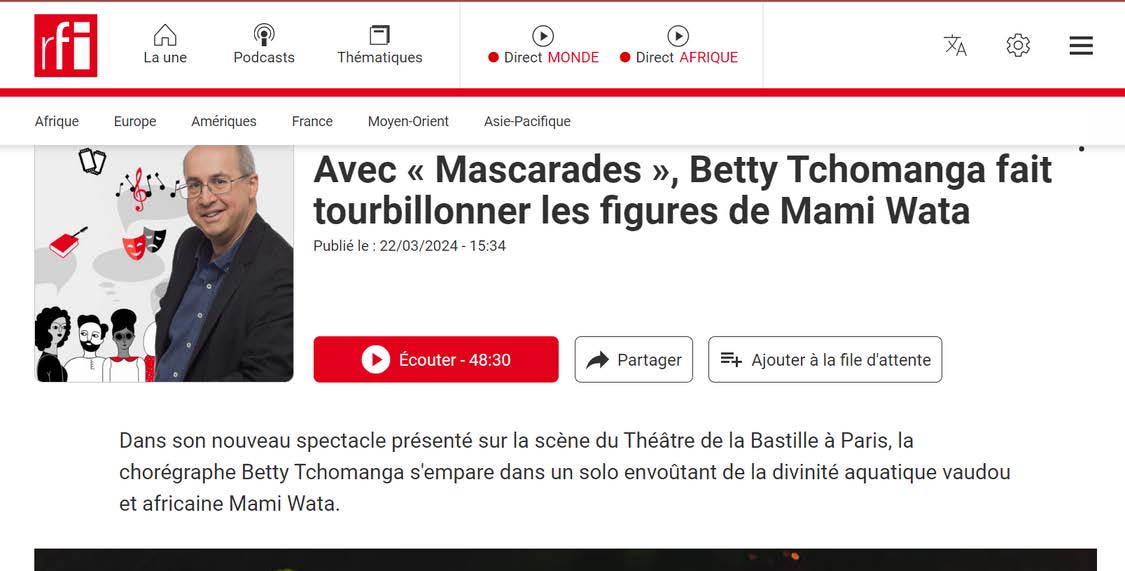 « Dans son nouveau spectacle présenté sur la scène du théâtre de la Bastille à Paris, la chorégraphe Betty Tchomanga s'empare dans un solo envoûtant de la divinité aquatique vaudou et Africaine Mami Wata. »