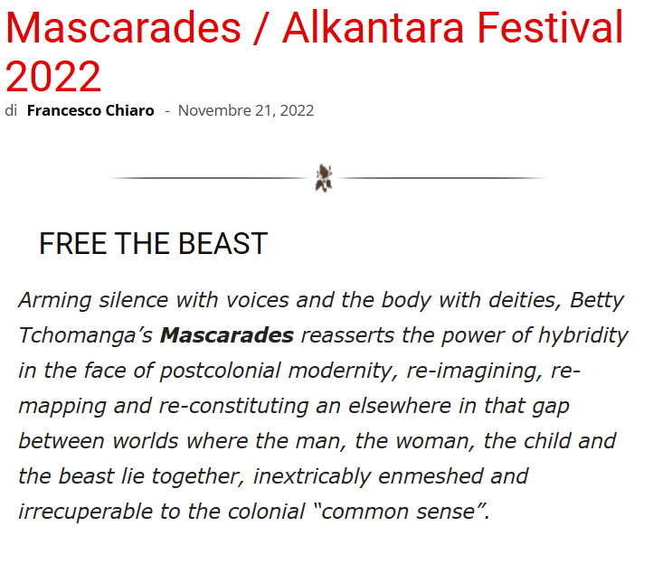 « Arming silence with voices and the body with deities, Betty Tchomanga’s Mascarades reasserts the power of hybridity in the face of postcolonial modernity, reimagining, re-mapping and re-constituting an elsewhere in that gap between worlds where the man, the woman, the child and the beast lie together, inextricably enmeshed and irrecuperable to the colonial “common sense”.»